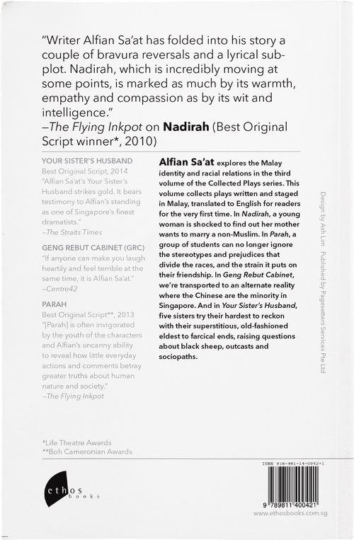 Alfian Sa’at explores the Malay identity and racial relations in this third volume of the Collected Plays series. This volume collects plays written and staged in Malay, and translated to English for the very first time. In Nadirah, a young woman is shocked to find out her mother wants to marry a non-Muslim. In Parah, a group of students can no longer ignore the stereotypes and prejudices that divide the races, and the strain it puts on their friendship. In Geng Rebut Cabinet (GRC), we’re transported to an alternate reality where the Chinese are the minority in Singapore. And in Your Sister’s Husband, five sisters try their hardest to reckon with their superstitious, old-fashioned eldest to farcical ends, raising questions about black sheep, outcasts and sociopaths.