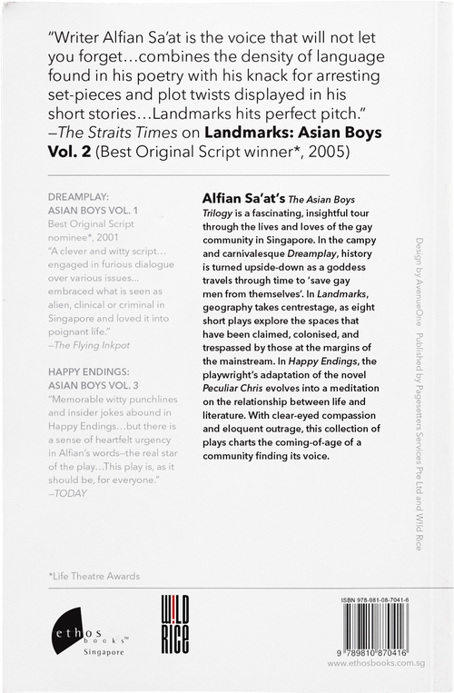 “Writer Alfian Sa’at is the voice that will not let you forget…combines the density of language found in his poetry with his knack for arresting set-pieces and plot twists displayed in his short stories…Landmarks hits perfect pitch.” —The Straits Times on Landmarks: Asian Boys Vol. 2 (Best Original Script winner*, 2005)