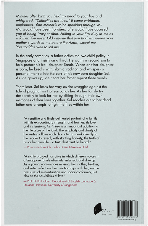 "Moving between the prosaic and the poetic, First Fires travels through metaphor, memory, and myth to unravel a familiar yet original narrative of familial life, love, and loss. An intriguing debut novel." —Dr Warren Mark Liew, Department of English Language & Literature, National Institute of Education