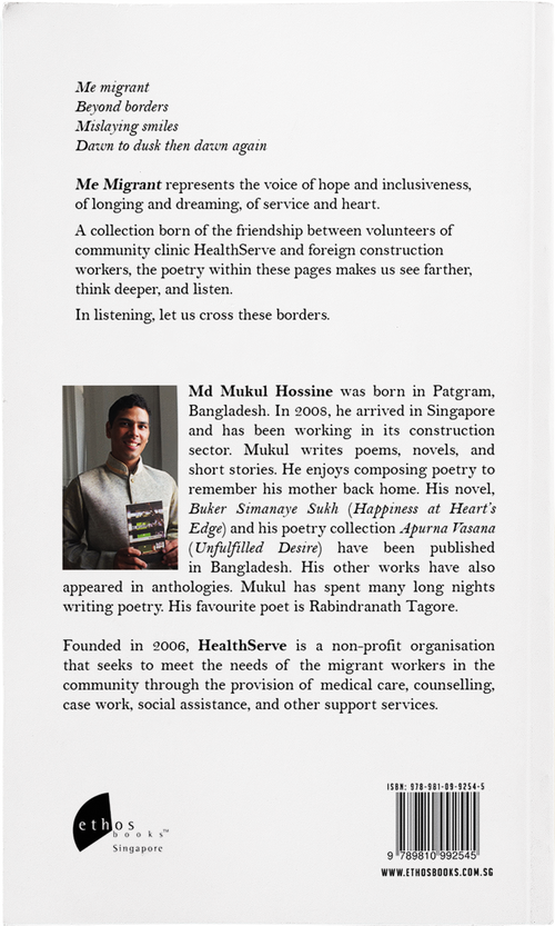 Me Migrant features the poems of Md Mukul Hossine – poems originally written in Bengali by Mukul, transcreated by Singapore poet Cyril Wong based on English translations by Fariha Imran and Farouk Ahammed. It represents the voice of hope and inclusiveness, of longing and dreaming, of service and heart.