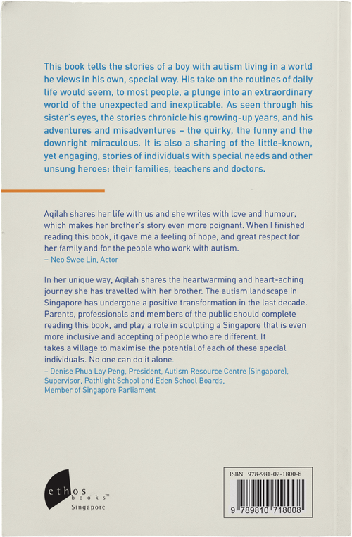 “In her unique way, Aqilah shares the heartwarming and heart-aching journey she has travelled with her brother. The autism landscape in Singapore has undergone a positive transformation in the last decade. Parents, professionals and members of the public should complete reading this book, and play a role in sculpting a Singapore that is even more inclusive and accepting of people who are different. It takes a village to maximise the potential of each of these special individuals. No one can do it alone.” – Denise Phua Lay Peng, President, Autism Resource Centre (Singapore), Supervisor, Pathlight School and Eden School Boards, Member of Singapore Parliament