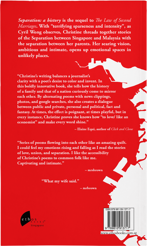 The sequel to The Law of Second Marriages, the best-selling and critically acclaimed poetry book by Christine. With "terrifying sparseness and intensity", as Cyril Wong observes, Christine threads together stories of the Separation between Singapore and Malaysia with the separation between her parents. Her searing vision, ambitious and intimate, opens up emotional spaces in unlikely places.