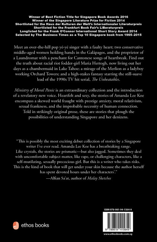 "There is a deftness of touch, a sureness of intent, a knowingness of accomplishment that makes it hard to believe that Ministry of Moral Panic is Amanda Lee Koe’s first book of fiction. She has marked out in virgin territory a realm of her own, a kingdom of weird, non-conforming, stubborn passions in Singapore. And she has done so without resorting to the usual pieties of understanding and tolerance. She has looked directly at the contorted subject and drawn every contortion that she could see... the collection is eminently readable. I should know. I read it straight through, all fourteen stories, on my flight from Singapore to New York. I had not been able to read on a plane for a while. Too uncomfortable and distracted. But these stories carried me to the end." —Koh Jee Leong, author of The Pillow Book