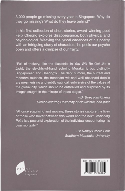 Felix Cheong’s Vanishing Point is the first work of fiction by a Singapore writer to be inspired by real-life cases of missing persons. These stories do not speculate where these people have gone to but are a creative leap-off to explore the theme of absences and obsessions.